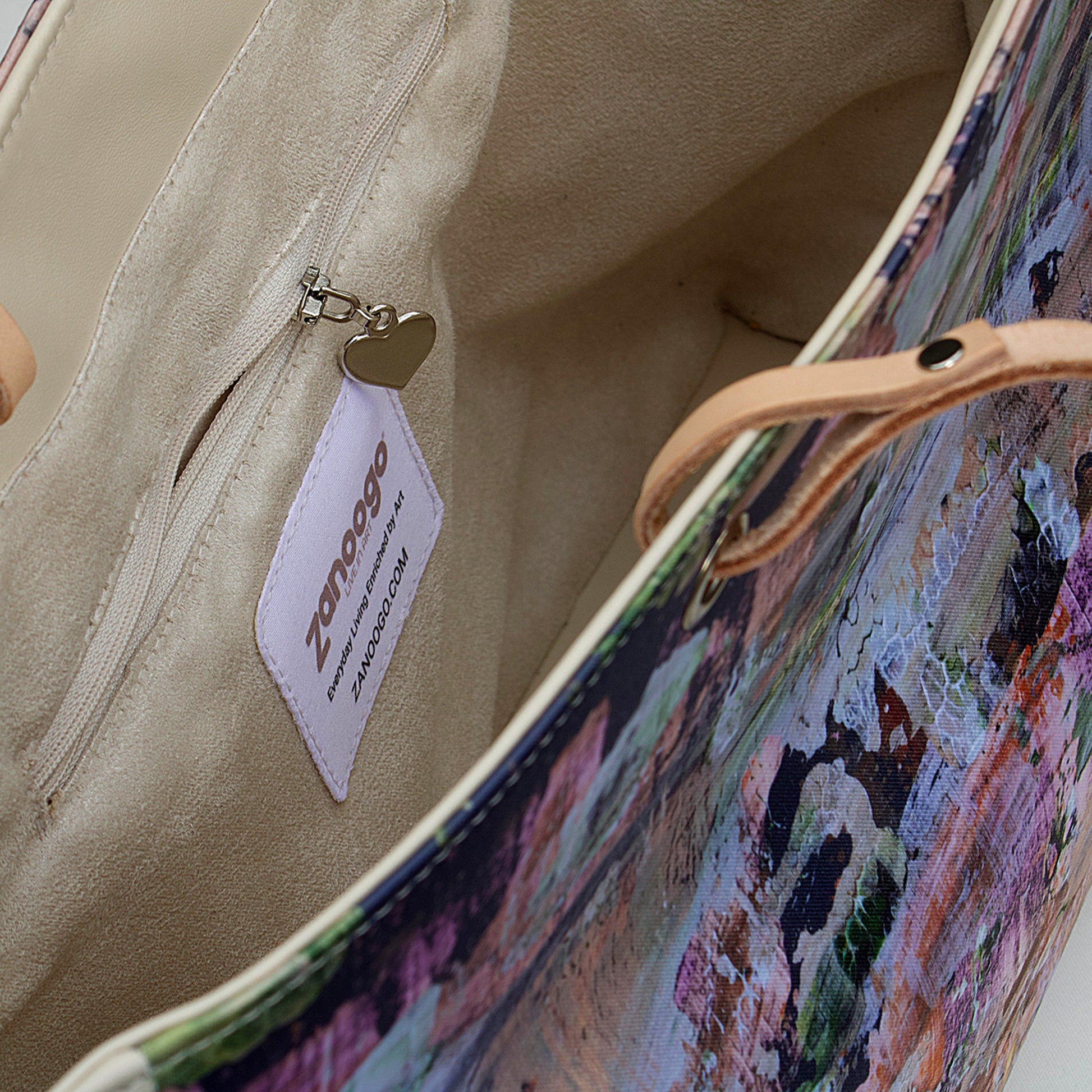 Every bag is printed, stitched, and assembled to order in London by skilled makers. The body combines Monroe Satin panels with your choice of Nappa leather trim, creating a piece that is tactile, strong, and visually striking. Inside, two pockets - one open, one zipped with a silver charm pull keep your essentials organised. Chrome stud feet protect the base from everyday wear.